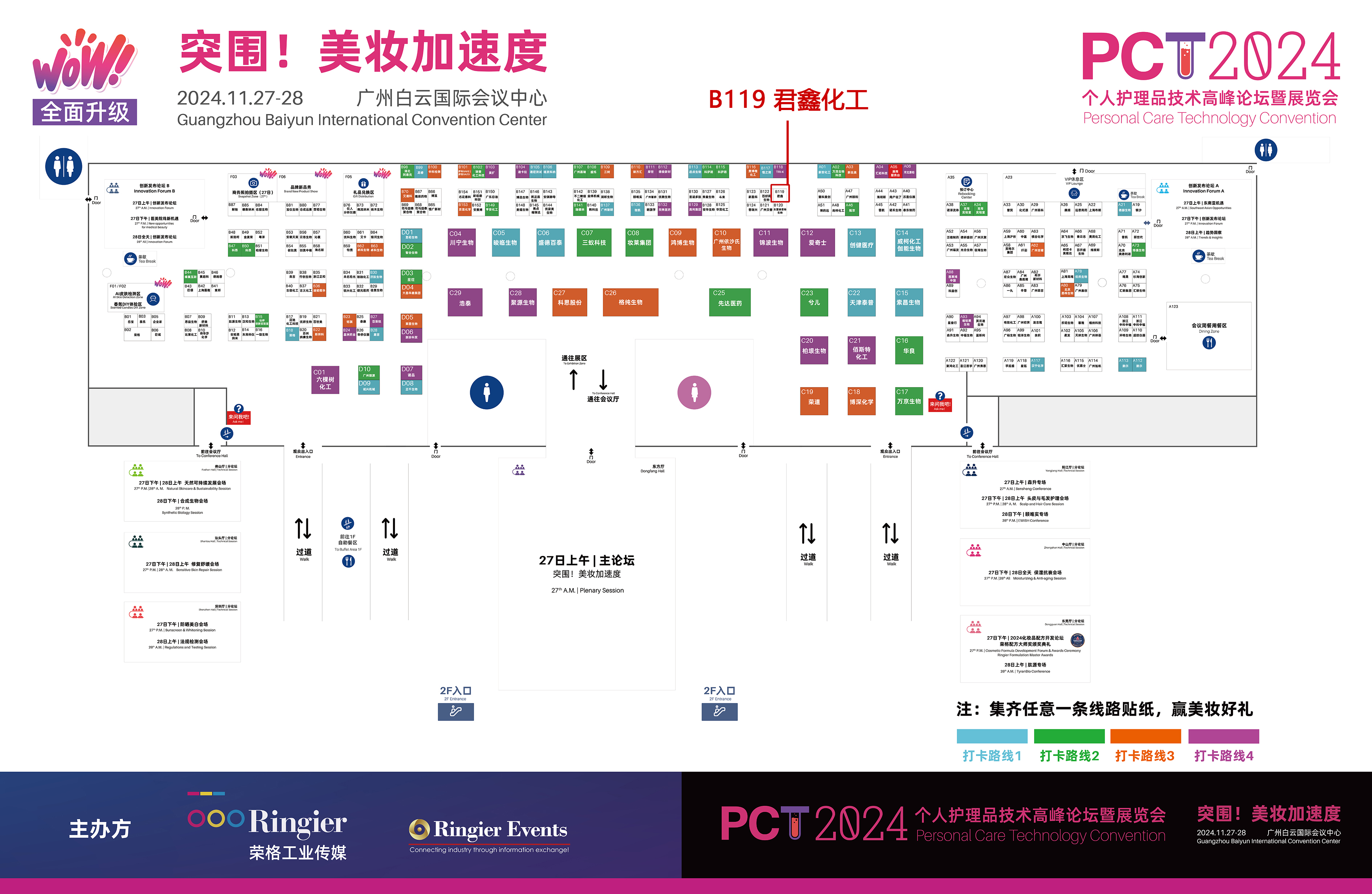 个人护理品行业正以前所未有的速度蓬勃发展,技术的革新与消费者需求的多元化正引领着行业的未来方向。为了共谋行业发展新蓝图,探索技术创新与应用的前沿,PCT2024个人护理品技术高峰论坛暨展览会将于2024年11月27-28日,在广州白云国际会议中心盛大启幕。君鑫化工荣幸受邀出席此次盛会,并诚挚邀请您莅临我们的展位:B119。