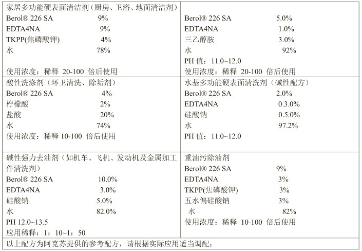 1、将 BEROL 226 与一种复合剂和一种助洗剂作简单的组合,就可制成品质优异的水性去油剂。